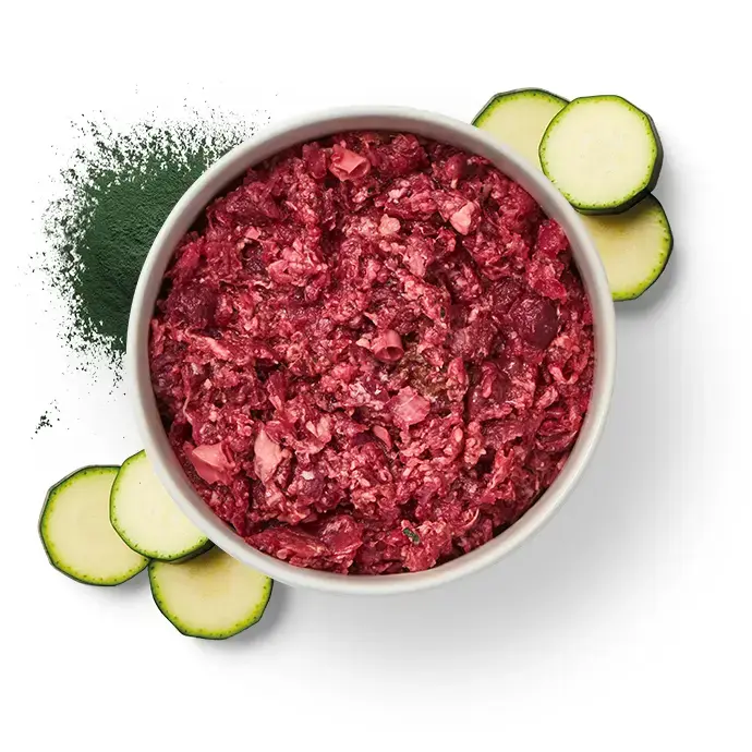 73% rabbit (meat and bones), 13% turkey heart, 5% turkey liver, 5% mixed raw courgette, 2% rabbit hearts, anchovy and sardine oil, spirulina. Approximately 13% bones